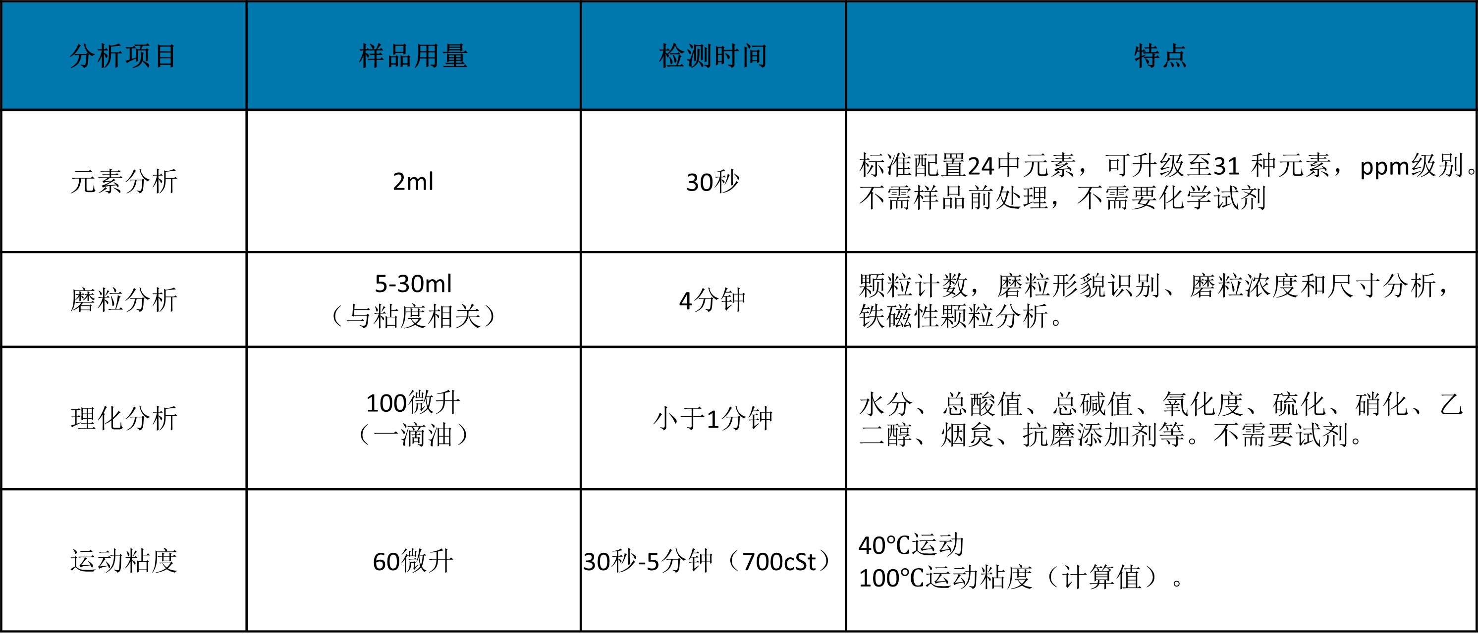 元素分析、磨粒分析、理化分析、运动粘度四个模块的检测样品用量、检测时间,仪器主要特点见表1.