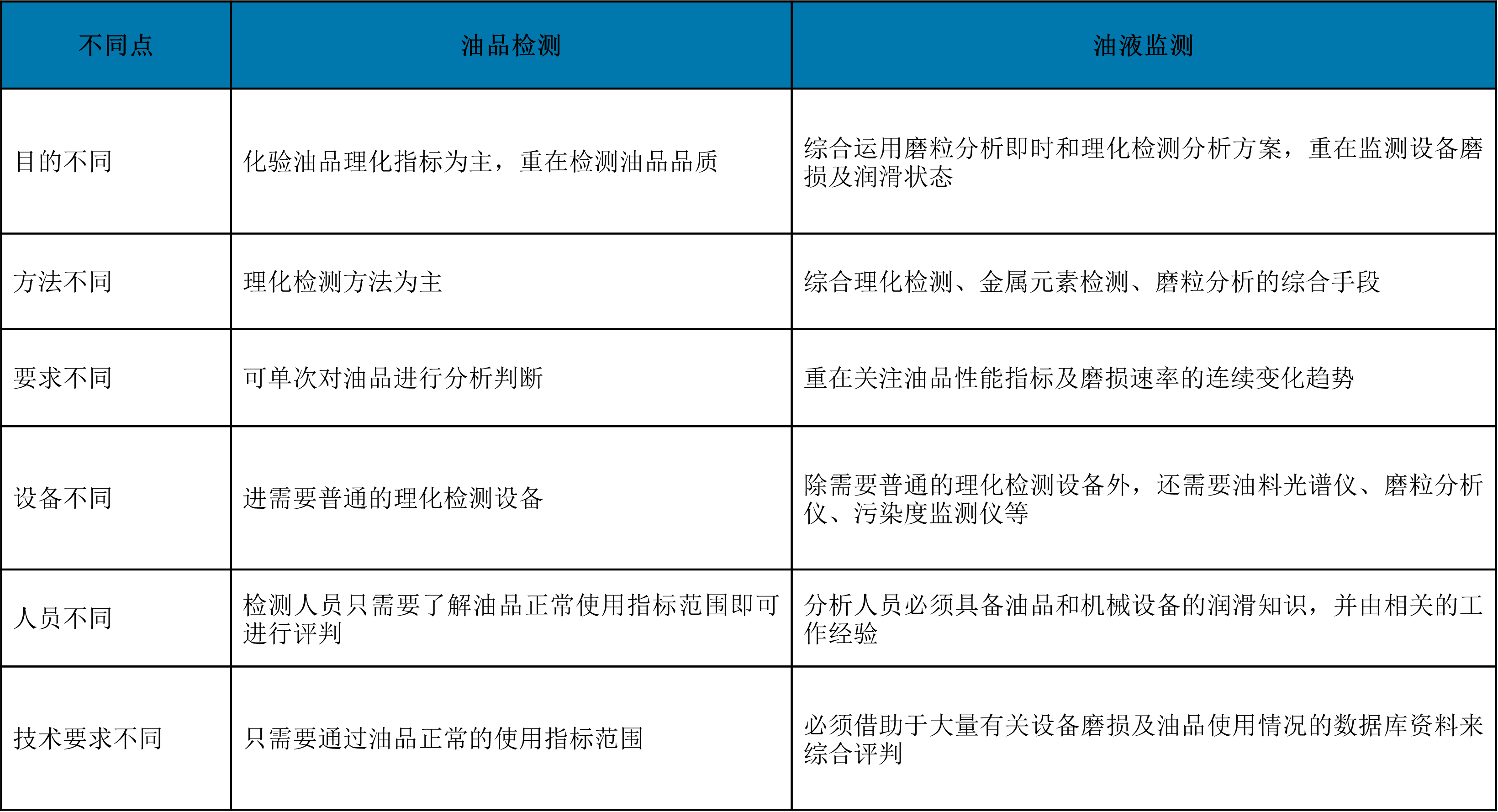 油品检测与油液监测技术有着本质性的区别,从目的、方法、要求、设备、人员、技术等多个方面均有区别,具体区别见表2.