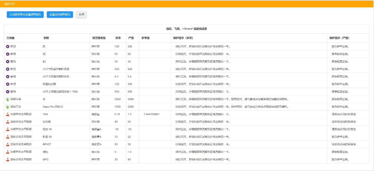 TruVu360提供了一种基于状态的报警功能,该功能基于ASTM D7720《用油液分析法监测设备和油的健康和污染情况对测量报警值进行统计和评估的标准指南》,对报警值进行统计和评估;对不同的设备及润滑组件类型内置注意、警告报警限值如图2所示,并允许用户编辑和修改适合现场设备的最佳报警值。