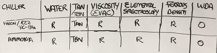 酸值/碱值 - 对于氟利昂或R-22等氯化制冷剂,建议对总酸值(TAN)进行测试。对于氨基系统,建议对总碱值(TBN)进行测试。总碱值会影响制冷剂中润滑剂的混溶性。